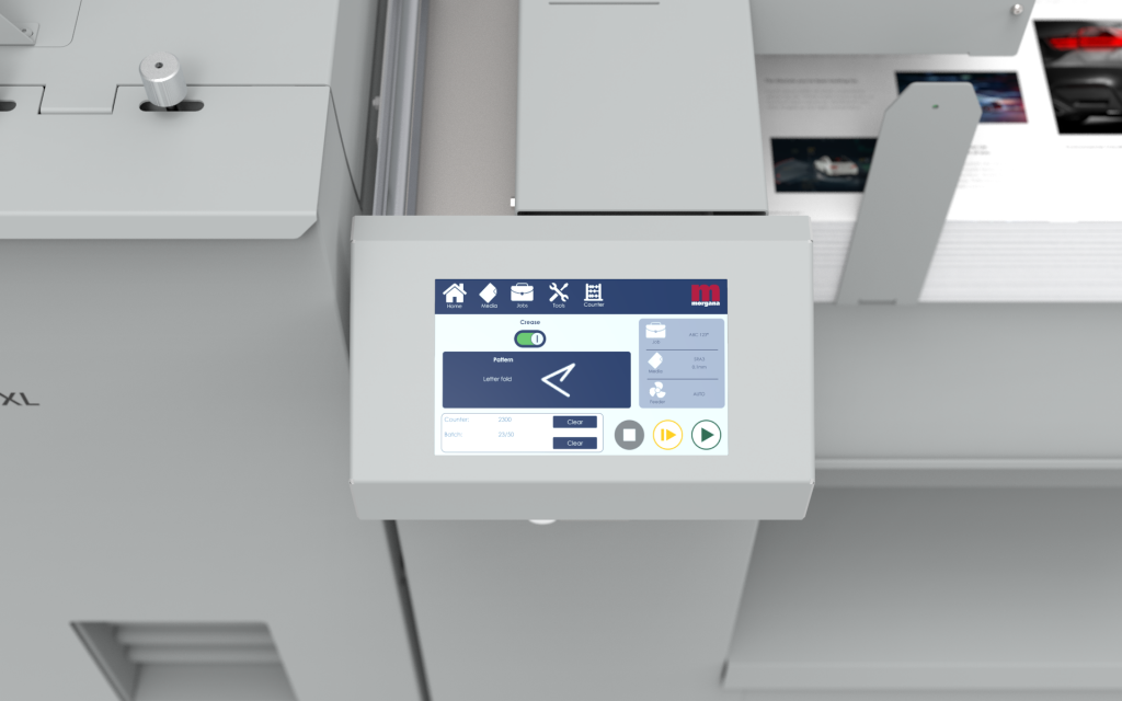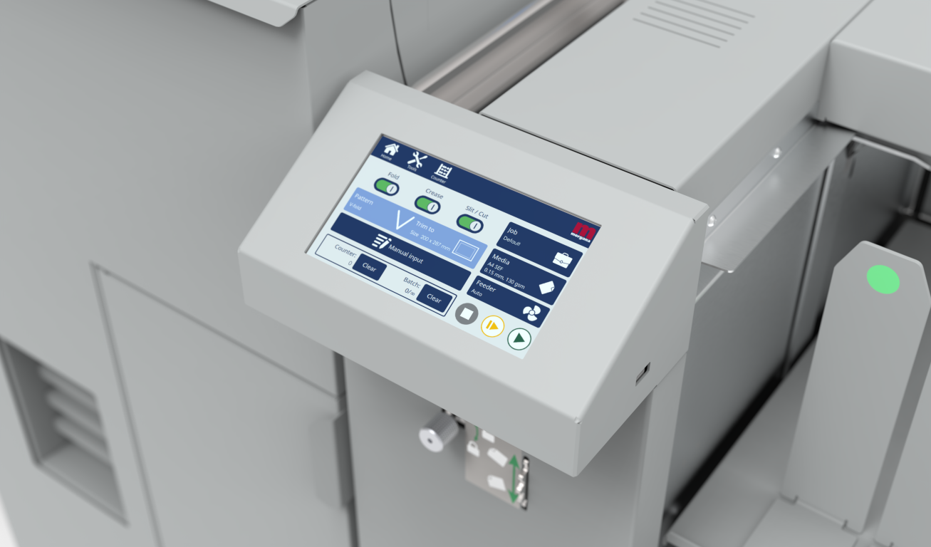 An intuitive colour touch screen with a run screen that gives you a complete overview of the job in progress. Basic adjustments can be made “on the run” and access to crease and fold patterns is simple. The user interface is available in multiple languages. With new ‘Auto-settings’, this truly unique function takes care of the roller gap settings, speed adjustment and fan settings, removing time-consuming adjustments of various settings.